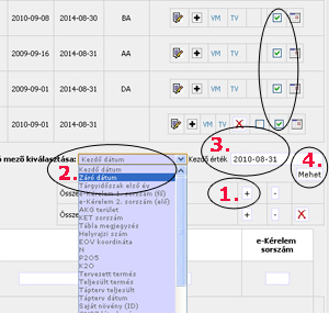 2) Ha a tábla fizikai dimenziója nem változik, de van főnövény váltás (vagy másodvetés), akkor azt a táblasoros szerkesztőben a + gombbal kell létrehozni, amely azonos GN sorszám alatt növekvő alsorszámon egy új (al)tábla sort generál. A naplózást erre kell végezni, AKG-s tábla esetén a KET-hez is hozzá kell rendelni.
